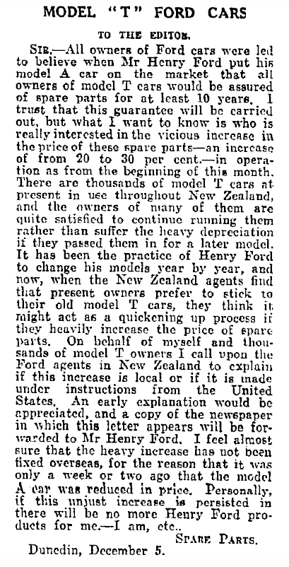 The first was a letter to the Otago Daily Times, dated 16th Dec 1929. Clearly there had been, or was about to be, a significant increase in the cost of spares, and the writer was unhappy: