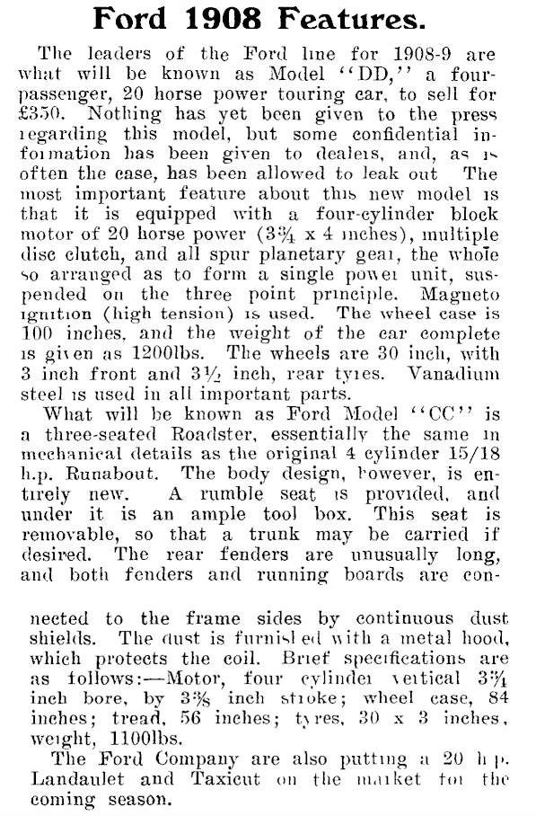 I came across this article in the Sept 1908 copy of "Progress Magazine", a [approx monthly] periodical published in New Zealand from 1905 to the 1920's. The mag appeared to have a reasonable degree of motoring and other contemporary engineering news, and had obviously been given some 'inside news' re a new upcoming Ford car...