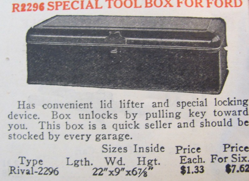 Just seen on EBAY, ending in a couple of days: a running board tool box in very nice condition. Included with it is a reproduction Model T Service Manual, a Model T Owners Manual of unknown year, a few tools that look to be later vintage than T, but the big surprise is a Minnesota Title and Insurance Card for a 1923 T. The date on the insurance card is more than 15 years old. I could not tell whether the title was open. The unusual thing about this auction is that its being offered by a Phoenix, AZ PAWN SHOP ! How a pawn shop got these items, I do not know, but I hope they were obtained LEGALLY ! Most people have heard about stolen items being pawned, which raises my suspicion.