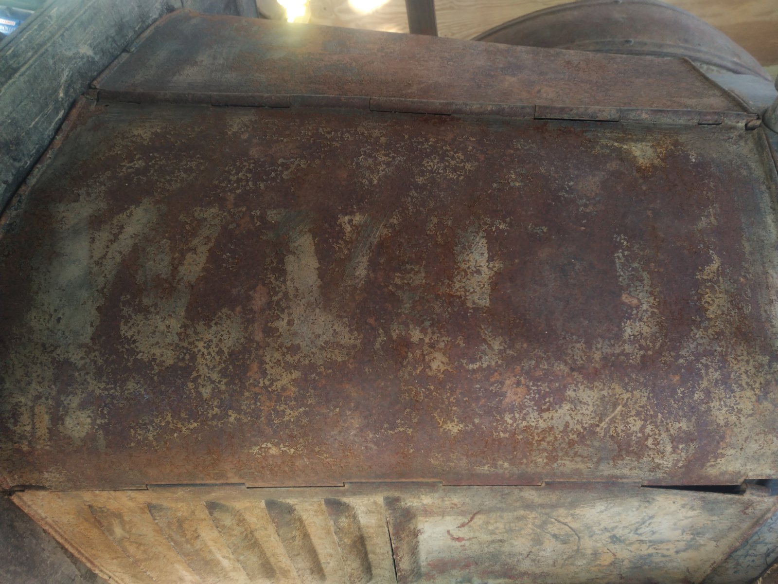 metal rain shield on top of wood fire wall: 1919 or later upgrade, assuming body has authentic patent plate, and from its condition is reasonable to assume