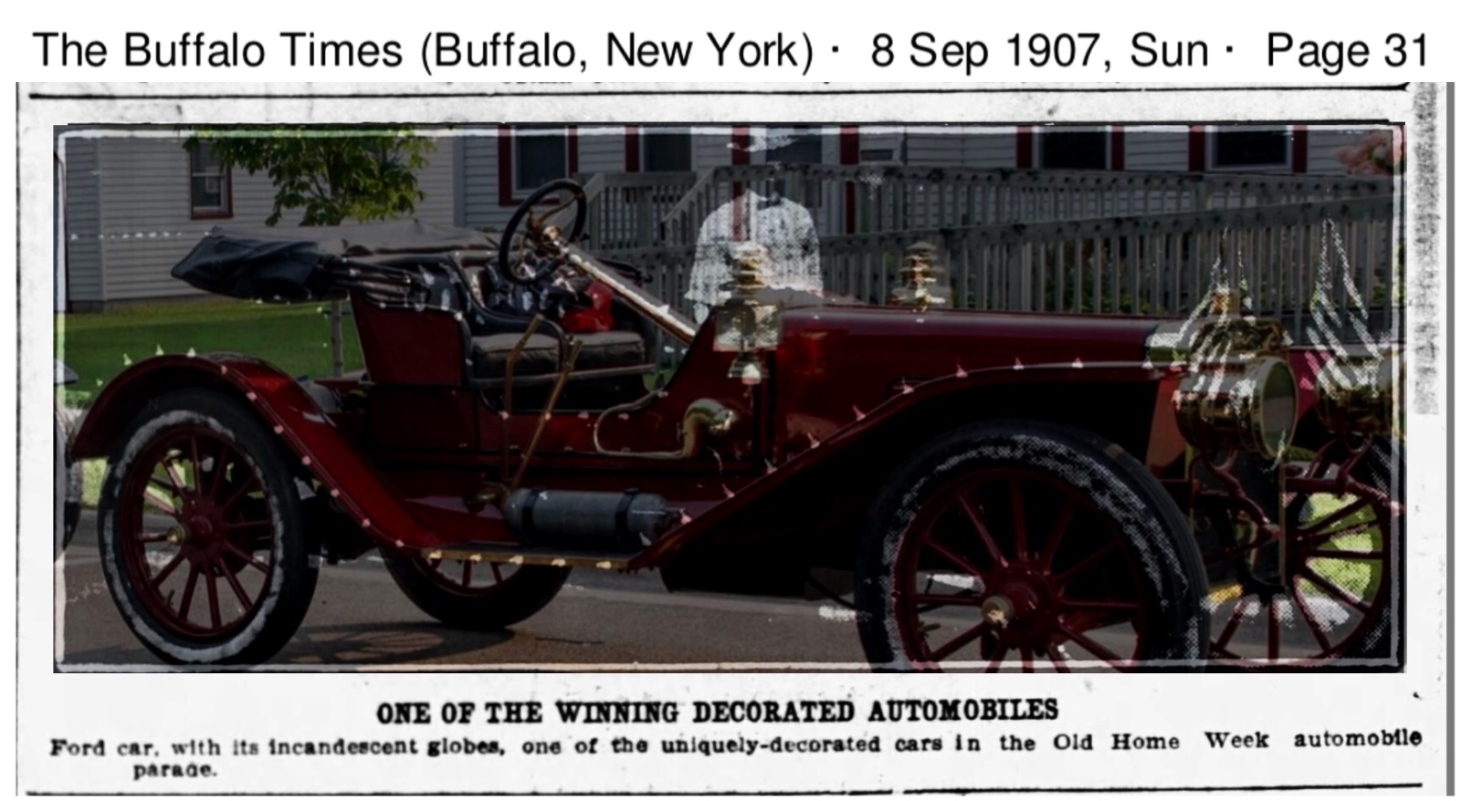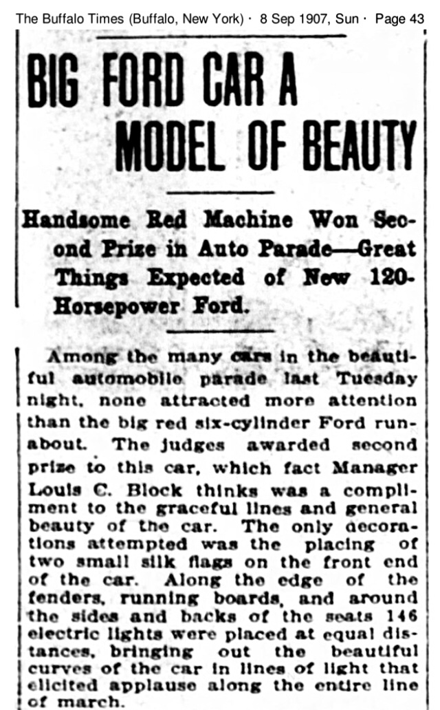 It took a few years, but I’ve finally located a newspaper photo of the 2nd place Ford, with lights along it’s lines: