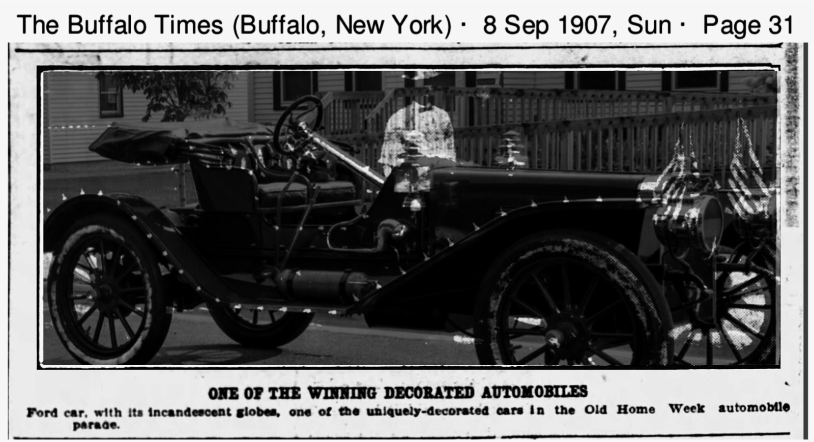 On the same page, although difficult to see, is a photo of the winning Thomas Flyer. The trophies were awarded to parade participants. I’m glad the Ford Agent didn’t feel the need to “dress” up the Ford roadster as the Thomas was. It’s is decked to look like a big eagle over it’s nest..........