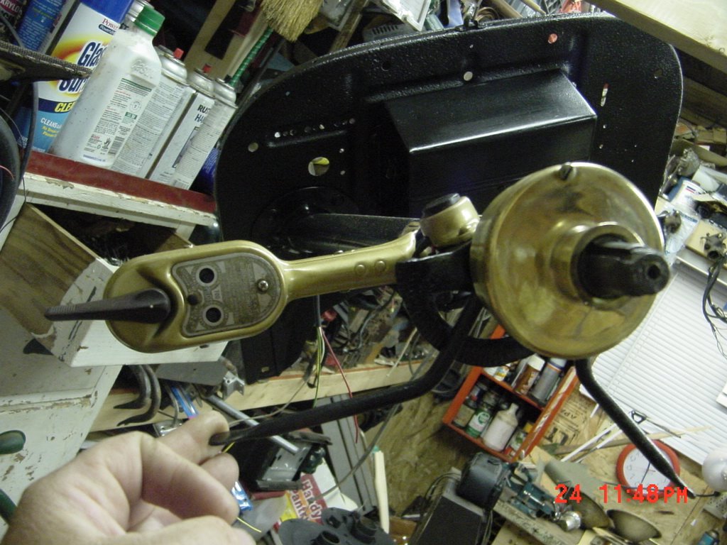And, I bought off of Fleabay an old add on directional switch for the steering column and used it after replacing all the original wires on it. I machined down some aluminium on the lathe and parted it off to make a thick disk, and I cut a "V" in the side of it, and finished forming it with a file to fit the steering column, so the mounting clamp for the directional would seat properly on the steering column.