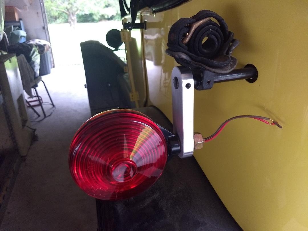 I used harbor freight dual face red/amber trailer lights. Bob Doris fabricated the brackets which attach to the top tie down post on each side of the touring. The set of lights on the rear has good visibility of the amber lights from the front of the car as well as red Tail,stop,turn. from the rear. Brackets with lights can be quickly removed for show and stowed under seat. Flasher switch is a double pole double throw center off switch mounted in a existing dash hole with LED ready flasher with built in sounder.