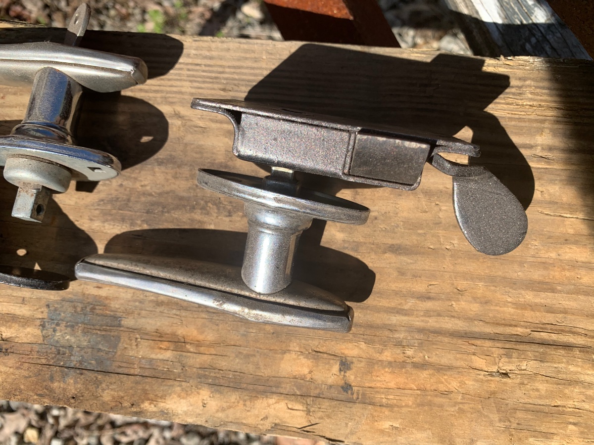 Travel Trailer. That style handle was quite popular, and there were even companies that made "knock-off" replacement handles for Model As and other cars, I once saw a flyer for some, it was most interesting as the construction method was identical to the Ford handles. The flat mount, and the thin latching, with the thumb lever reminded me of the little trailer we had when I was a kid. Wasn't very big, but with the bed in the back, and the table up front made into a bed, AND the pull-out one over the table, you could sleep 5. No bathroom, just a stove and fridge/icebox. Most of us kids slept in the Station Wagon. Two trips to Mexico and numerous trips to Death Valley and Dessert Hot Springs with that set up. Four of us Kids, I was 10?; my little sister was a baby at first and then hmm, maybe 3 years old. I don't remember when we stopped doing that, I think when my brothers graduated from high school; about 1968 or so.