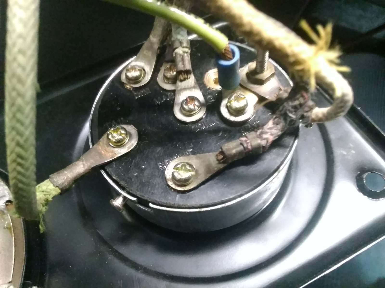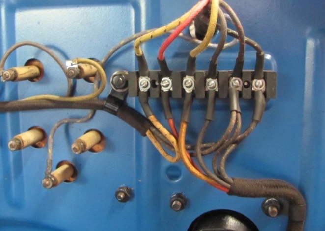 The 6 wires (Left to Right) are Yellow/Black- Generator/to Bat switch terminal, Red to Mag switch terminal, Yellow to the Ammeter terminal {a short jumper wire from other Ammeter terminal to Bat switch terminal} , Tail to Tail switch terminal , Dim headlamps to Dim switch terminal, Bright headlamps to Bright switch terminal.