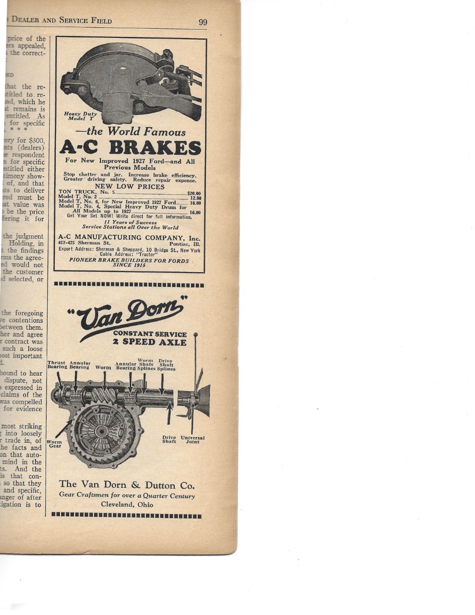 While looking through my Ford Owner and dealer magazines for more Gould ads I found these for the Van Dorn two speed axle for The Model TTs. This one is interesting in that their 2-speed unit fits inside the factory rear axle housings. This is another one that I've never heard of before and never seen. These were advertised from July of '26 until at least June of '27. Could be longer but the June issue is the latest that I have. They shrank that final ad down to a black and white, quarter page ad so I'm guessing they were running out of funds. It's hard to imagine that the company advertised for more that a year without producing any axles. So, same question as my Gould axle post. Has anyone ever seen one, owned one or know anything about them?