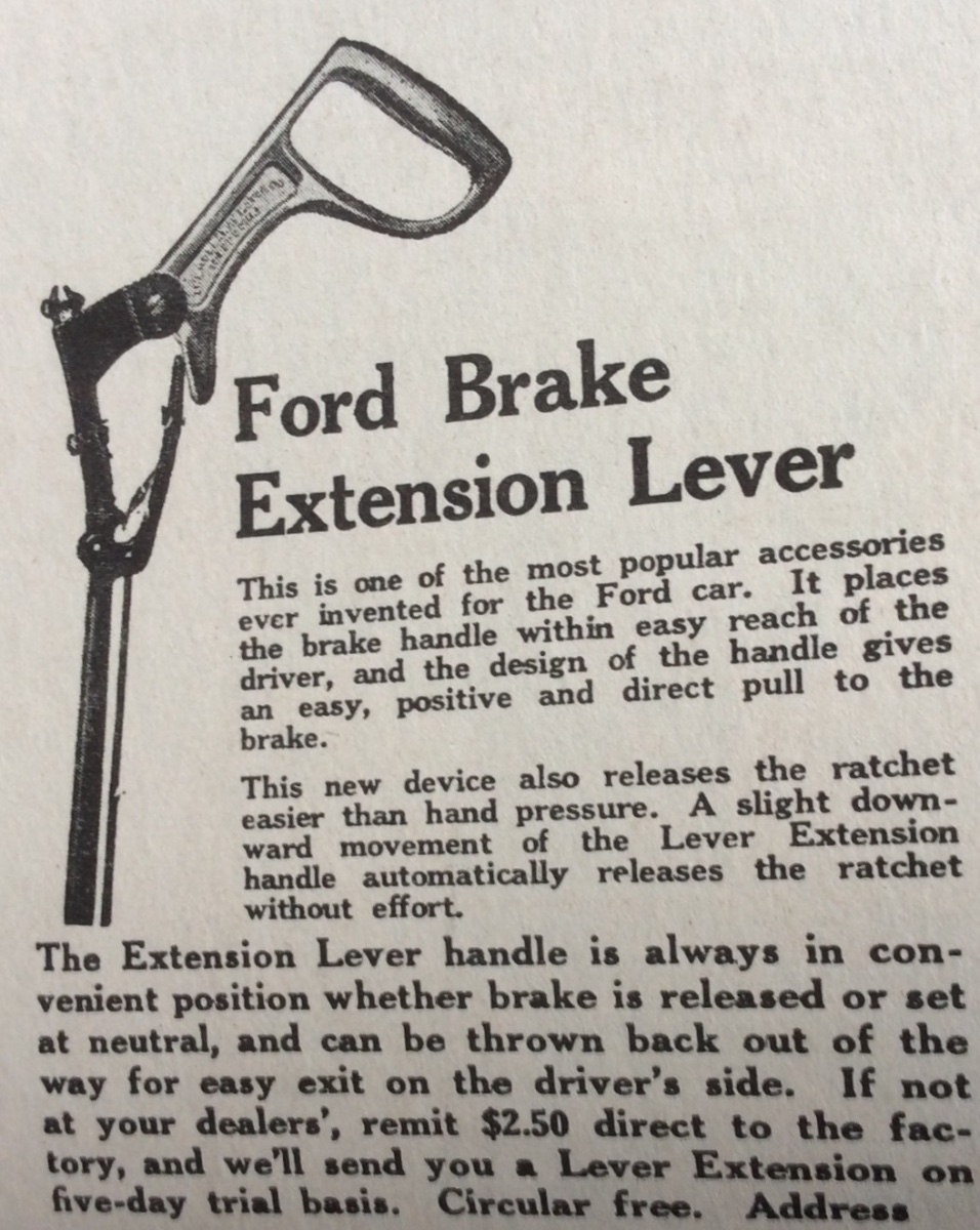 I’m 6’-3”, 225 lbs. With my long legs, that pedal extender would render the reverse pedal useless to me. It’s hard enough for me to use the pedals without the steering wheel getting in the way of my knees. With my big feet, I’m just grateful I have a ‘26 coupe, equipped with the wider brake and clutch pedals. Jim Patrick