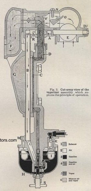 Mark, it is now evident to me that the oft referred to vaporizer cut away view which I showed above is wrong. Hole A and R are not on the bottom of the casting. There is no R hole but rather a hole A passing horizontally through the casting and the choke rod. Also there is a small diameter vent hole into the chamber surrounding the inlet tube (D) which would be between A and R on the drawing. When you choke a vaporizer the air intake horn is choked off and the vent at A is closed off leaving only that small vent hole.