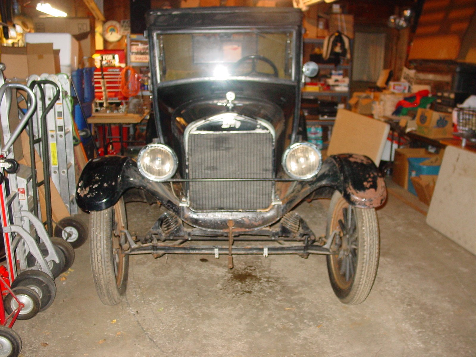 Welcome to the hobby! That looks like a nice beginning. I will jump into the same boat with those who say the water pump is likely a band-Aid to try to solve other problems. If the cooling system is clean I will almost guarantee that the radiator is bad. Is it a round tube or a flat tube? (Look closely at the radiator and see if the vertical tubes are round). If they are, the radiator is either original or an older replacement. If you plan to drive the car much, bite the bullet and buy a new Berg's flat-tube and yank the water pump. You will not have any overheating issues. I drive my '27 here in Sunny (not today) Florida with the temperature in the mid-90's and it runs cool. Get the car running - check the gas tank to see if it's clean. If not you will have to pull the tank, which is not a fun project on an "improved car" (26 and '27). Have the tank cleaned and then check for spark at the spark plugs. I will assume that the car has not been converted to 12 volts, so put in a known good battery and see if the ignition coils buzz when you turn the key switch to battery. If not, just press the starter button. It depends what the position of the timer is as to whether the coils buzz or not.. If you can get the coils to buzz the engine will probably run. Lastly - and there may be some disagreement here, but I would get the horn off the radiator support rod when you can; it was moved to that location to allow room for the water pump. The radiator rod was not designed to support the weight of a horn.