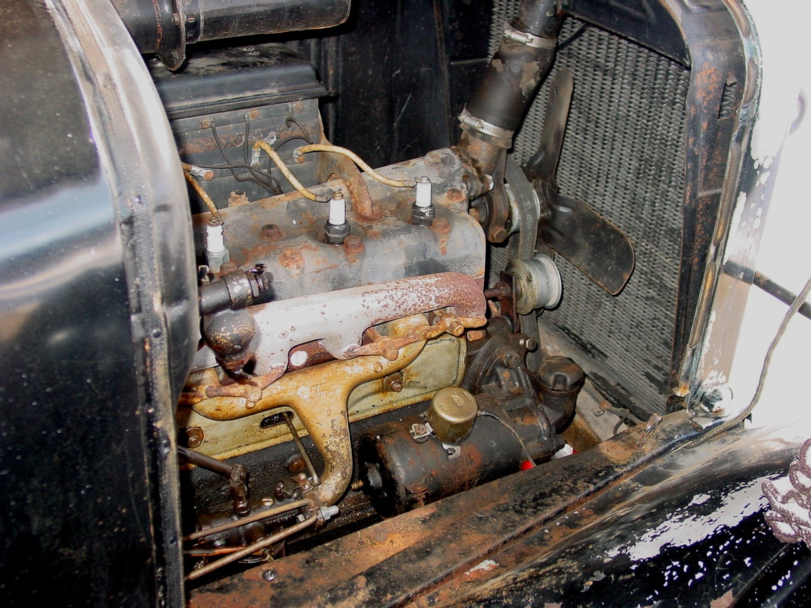 Couple of observations, the spark advance rod to the timer is placed over that large hose, unlike stock, you may have to change that out to get good timing. The carb has extra rod to it, that is linkage to a foot feed accelerator on the floorboard. The radiator is older aftermarket. Lastly, the radiator outlet with fan pulley is the early 1926 version, with adj. bolt below, Ford changed that to new style with fan shaft and eccentric to provide belt adjustment.