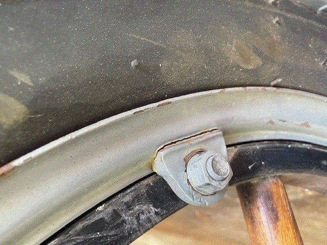 Recess the area of the lug base and surrounding rim hole metal with an angle grinder so that, after welding, you will have plenty of weld holding the lug, after you grind the weld smooth so it will not cut the tube. Since one lug was pulled loose, the other three might be the same way, so it would be wise to re-weld all of the lugs the same way, as a precaution. After completed, prime with red oxide primer and coat with a good, durable silver paint such as Sherwin Williams Silver Brite silver paint, made for coating metal roofs and one of the Brit East silver paint I ha e ever used. It must be constantly stirred and is applied by brush. It goes on splotchy, but as it dries, the pigment settles into a beautiful, smooth, bright, reflective, silver, much nicer than the dull gray galvanized coatings some recommend. Jim Patrick