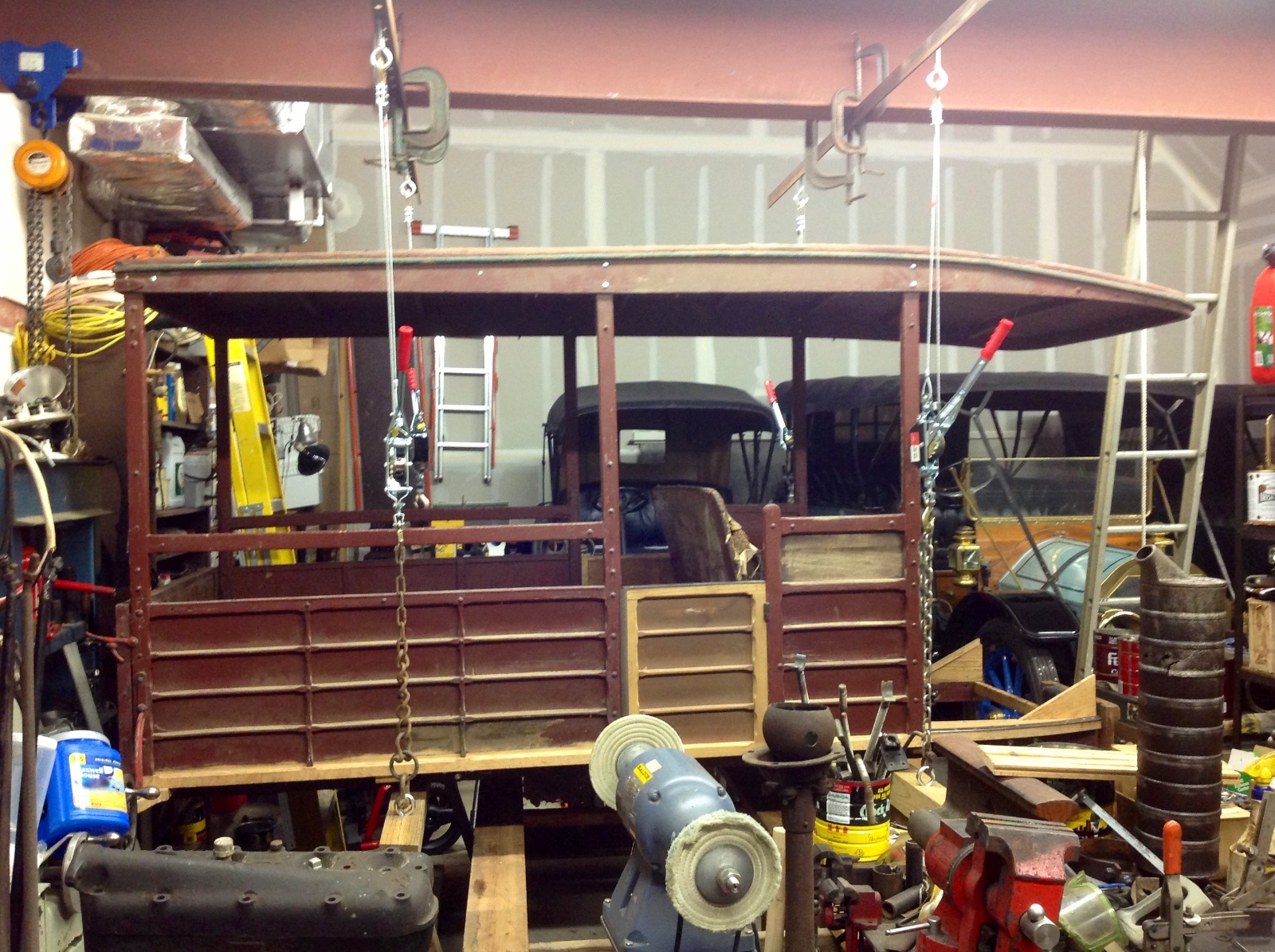 I'm almost ready to mount my 1910 Touring body onto the chassis and need some suggestions as to the best method to accomplish this. The body is still out west with Ray Wells, and until the stay-at-home order there is lifted he cannot ship it back, but I'd like to have an idea as to how to mount it onto the chassis as carefully as possible. It is completely refinished with a brand a new interior, so I imagine it will be a tad heavy. I've thought about just asking some friends over to heft it up and over but we would have to lift it past the gas tank, which sits fairly high. Maybe taking off the wheels and lowering the frame down would help. I do have an overhead chain fall, but my pole barn trusses are not super high so I'm not sure the chain fall could lift it high enough. Besides, I'm thinking if I attached four straps under the body and hooked them on the chain fall it may buckle the sides in. Anyone with experience mounting an early touring body I'd sure appreciate your input - thanks!