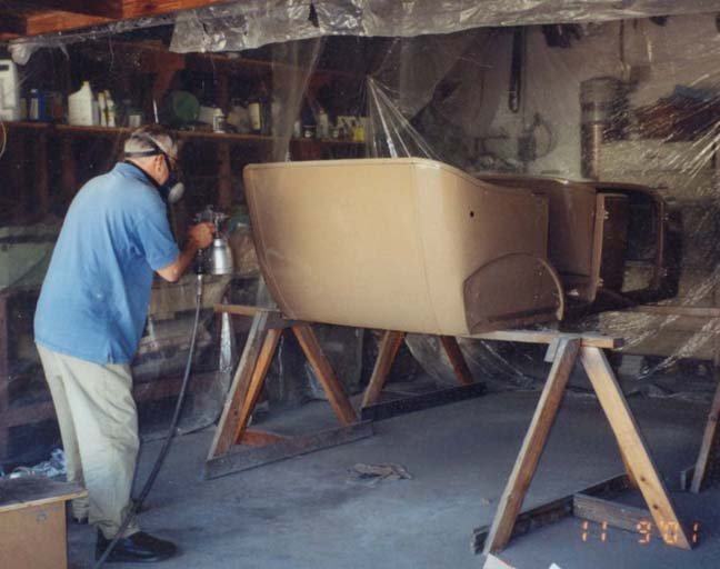 This is what I did with a 26 touring. I think it would also work with your earlier body. I made two horses out of 2x4's just high enough to be able to roll the chassis underneath without hitting the horses. The only picture I have is shown of me painting the body but to put the body on the chassis, I would turn it 180 degrees from that picture and roll the chassis under, rear axle first. Two men can lift the body up and set it on the horses.