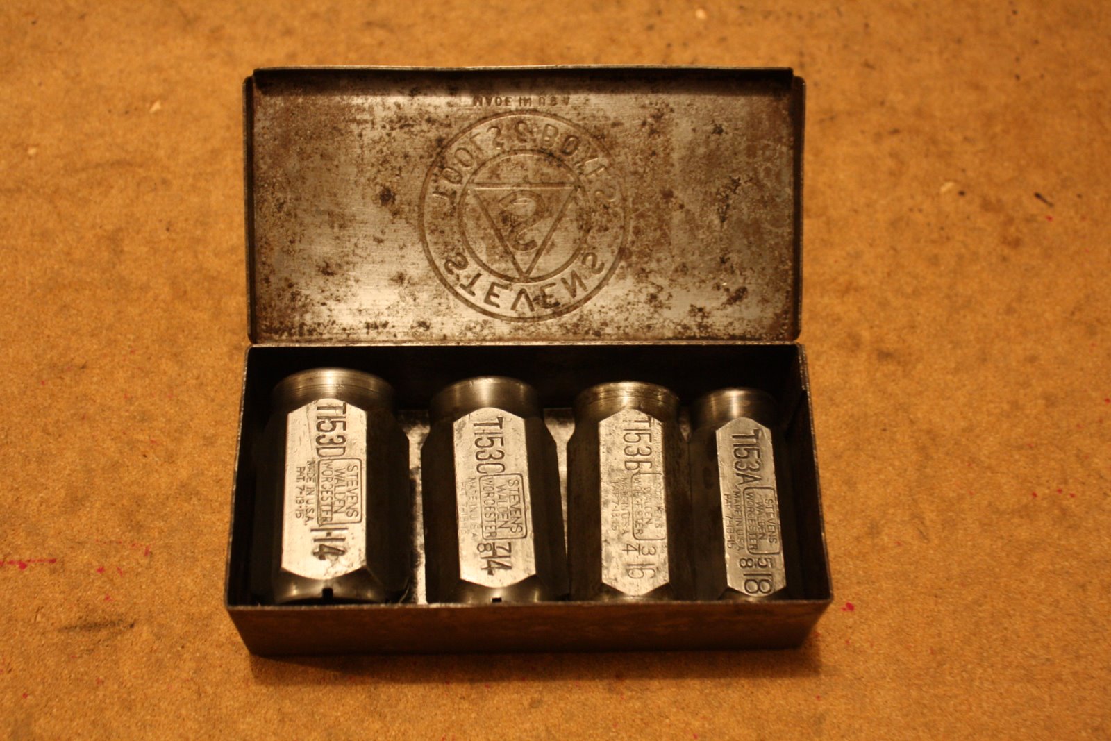 I found another Stevens tool for the collection. It is a set of "knock off" wheel pullers. It is actually a Stevens/Walden tool, but it is from the time period of the Stevens Walden buyout in 1926, so it is still a T era tool. The real neat thing is the box. I have never seen another steel box with the Stevens logo. This thing has been on E-Bay for over a year. It had a very low buy it now price but I never paid it much interest as it was listed as Walden tool. The box was very dirty so the Stevens logo did not show up well in the photos. I just happened to take another look at the auction and then noticed the logo. After I cleaned it up a little, the logo shows up nicely. Sometimes it pays to take another look ...