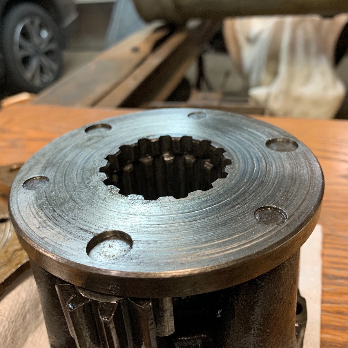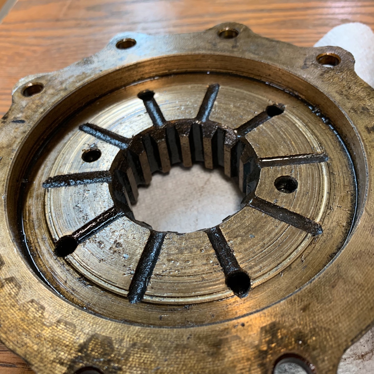 Thanks for the feedback. I've attached some clearer pictures. I already plan to replace the P139 bronze thrust plate. I think I've read every post that talks about it and from what I can gather, this is the most important piece for properly setting up the pinion/ring gear mesh and they are nearly always bent. I do not have a dial indicator to measure run out so I put my plate bearing side down on a flat surface and slid a socket underneath it at the lowest point. I shimmed up the socket until it was just barely scraping the underside when I rotated the plate. When I did this the gap went from nothing to more than 1/16". I understand that you can try to straighten them but I think I'll be just chasing my tail to get it perfectly flat again. Plus the underside looks fairly worn. So I think I’ll buy a new one. The sliding clutch gear and locking plate pictured, I wasn’t so sure about. Its easy just to replace everything but I do not like giving up on good used parts.