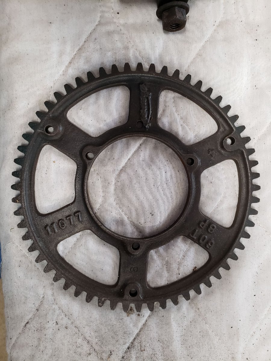 The big gear is the wheel gear... it mounts to the hub bolts of the right wheel.