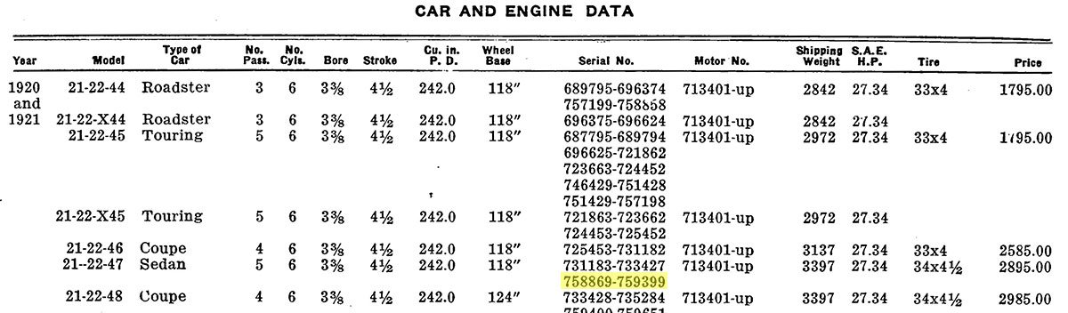 P. S. From my Buick book: Making it a 1921 Sedan if I read it correctly.