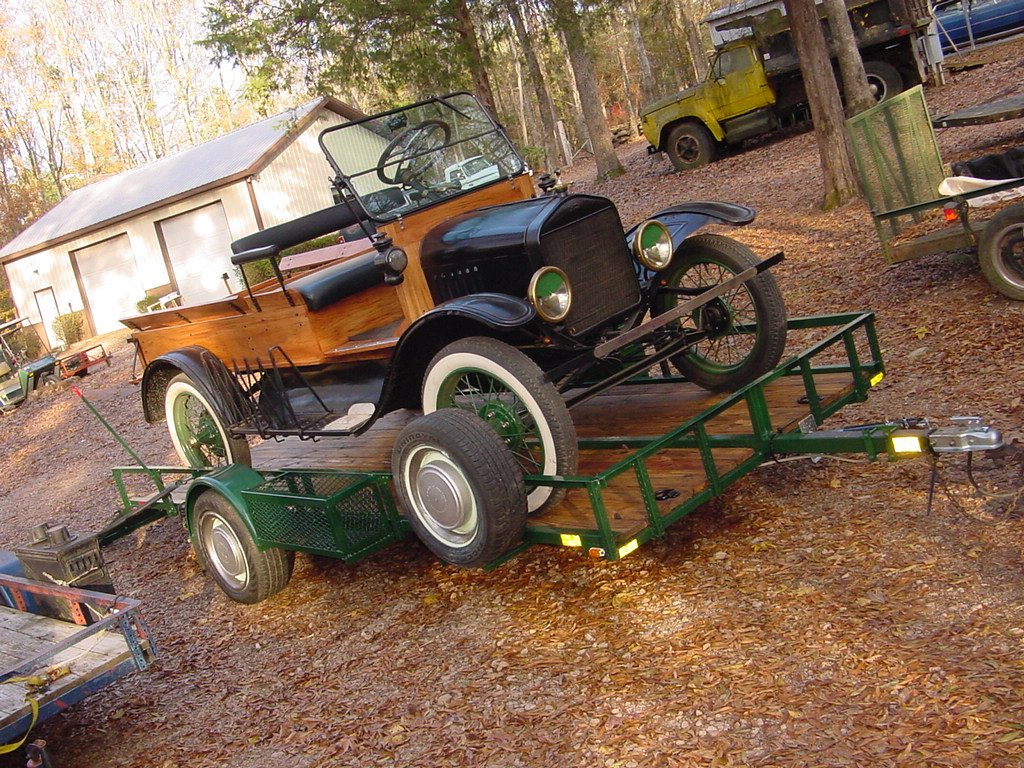 I have seen some really nice aluminum trailers for hauling cars. I wish I could afford one. My camper has an aluminum frame and it is very light for the size. Your 1500 should pull a trailer with a Model T OK. My Frontier pulled my utility trailer, like the green one that tdump showed, with my 15 touring car on it. It pulled OK over some mountains. I take it easy while pulling, 60 mph, and use the gears going down a grade. I follow the 60/40 rule for weight distribution. I have to use some extensions on the tailgate latches for the utility trailer to fit the Model T on it. I bought some really good radial tires and care a spare. It is single axle. I keep the bearing greased and the tires at the recommended pressure.