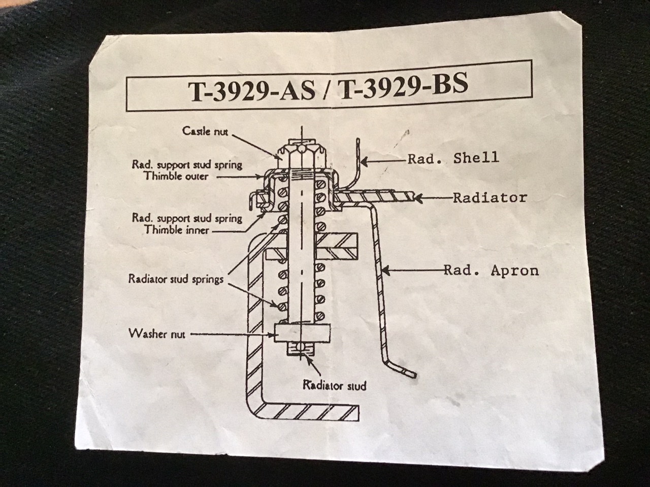 looking at the diagram posted by John, the way I do it is to put all the springs and thimbles on with the nuts but without the radiator. Then I tighten it down until the spring under the frame rail compresses. I then put something thick enough to hold the spring in the compressed position. You can use a small block of wood or a metal bar, anything which will fit there and also be easy to remove later.