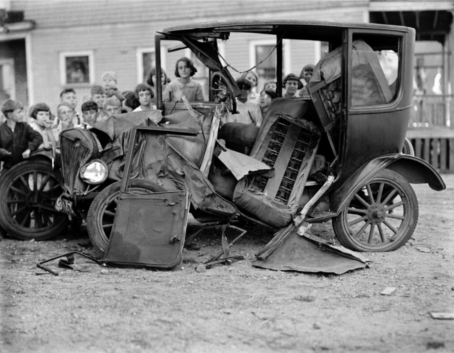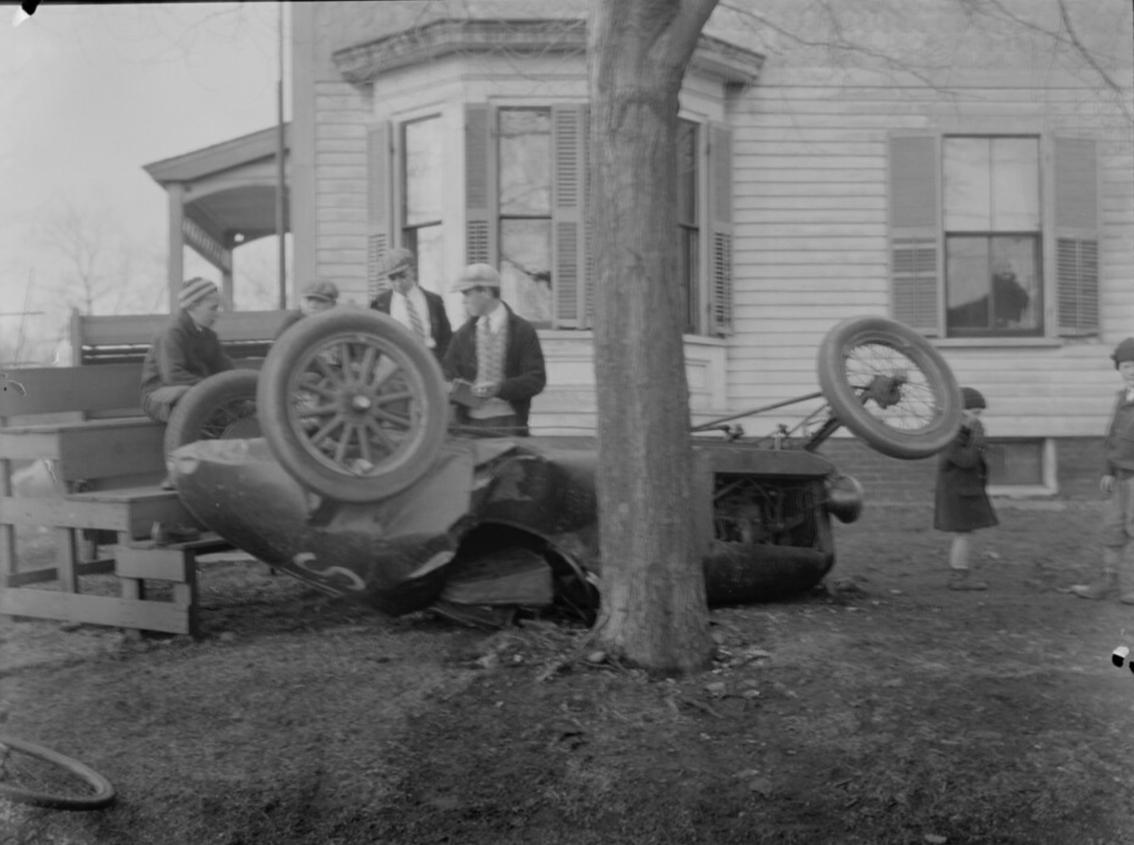 Wonder what the folks looked like inside with the flying glass in the center door! The glass went somewhere! But maybe the cars parts were piled up after the wreck? Kinda looks like it was staged that way with the people standing behind it. Makes you wonder.