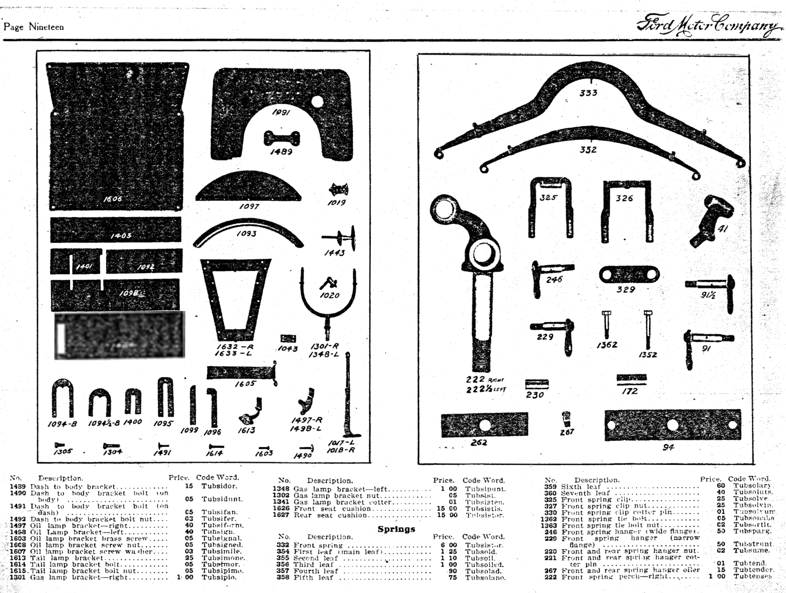 If I knew the Factory Number for the Tonneau (rear) mat or carpet for the Tourabout body , would be happy to get this from the Benson Research, but can't find such number. The Tourabout rear seat cushions (L and R) have Factory Nos. 2289 and 2290, but can't find listing for the mat or carpet.