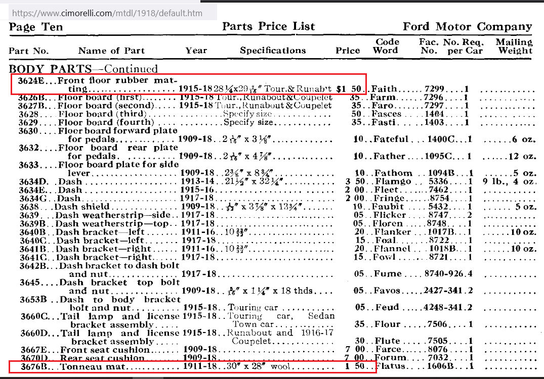 My guess would be the Tourabout used the Roadster w/ Mother Law rear mat, p/n 4409 Factory # 1665, "Floor Mat, Rear Roadster, 30 3/8" x 30"BRENT in 10-uh-C wrote: ↑Wed May 29, 2024 11:40 amCan I bring this thread back from the "depths" to ask a question as it pertains to a Tourabout? Would the factory-assembled Tourabouts have been furnished with a White Rubber Mat, -or would it have had a special sized Cocoa Mat (-i.e.: 30½"w X 21¾"l)?