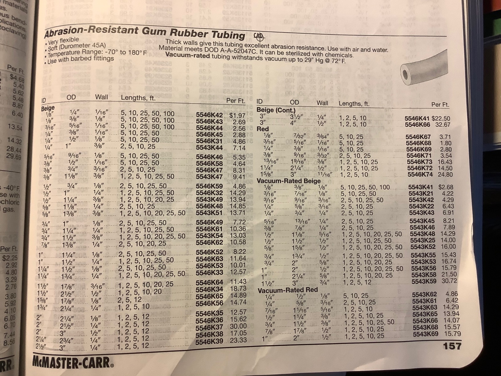 Art, here is the McMaster-Carr parts numbers. If you read up on the history of rubber, they started experimenting with adding material to change the durability of rubber very early on. From the original bits of it I’ve seen over the years, it’s swollen so much from age that a lot of 1/8” wall stuff was used back then, too. It would be my educated guess that white hose would be appropriate for very early cars, the red for later gaslight use. A personal choice, I would think, also. If anyone around here wants some, I’d be glad to order it in. ( original Smith is taking donations of used acetylene hose)