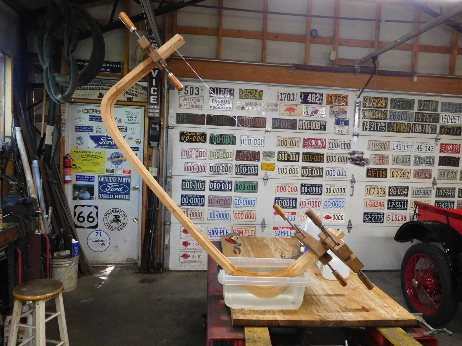 OK, here is my setup. I pulled the ends into position using a pipe clamp, then wired them together to hold them that way. The upper ends of the bows are hanging by a wire from the garage door track.