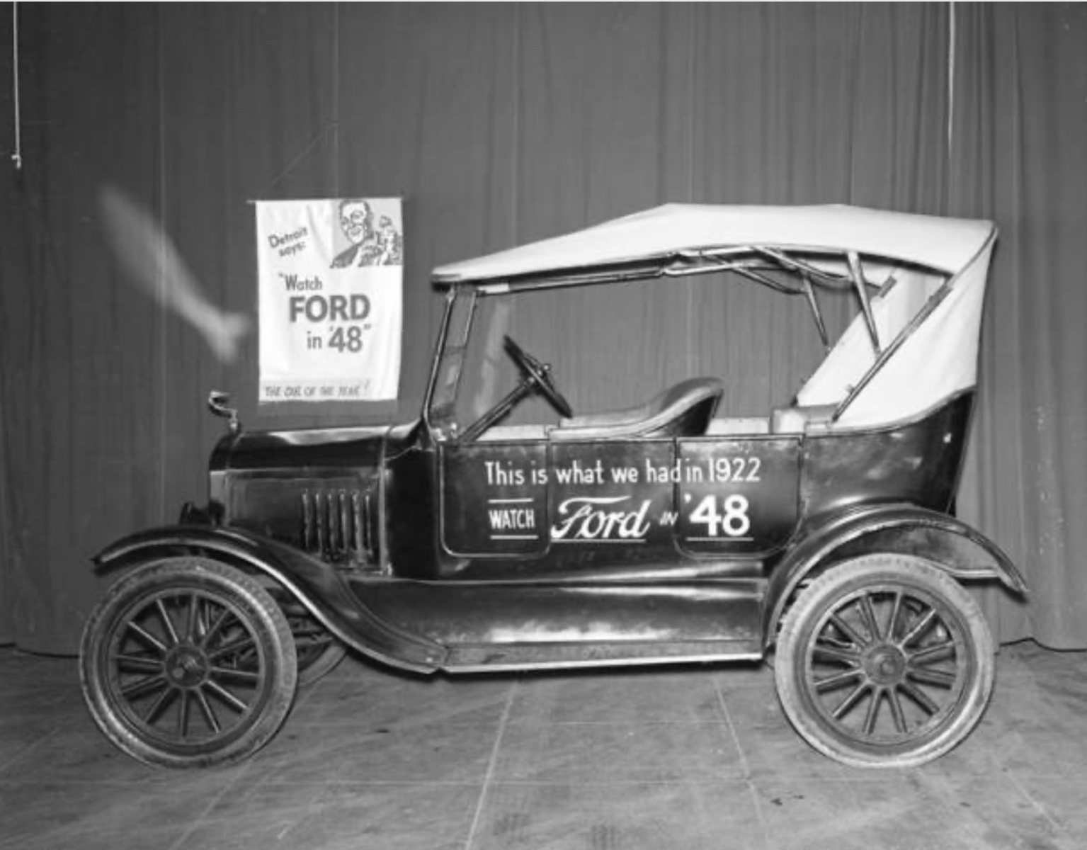 The car was gussied up with new top fabric and a later style rear window. That looks like paint on the hub caps rather than nickle. The license plate is Alabama and possibly 1946. I say that as the "Watch the Ford in '48" could likely be a 1947 slogan. '46 plates were white on black, '47 black on silver and '48 deep yellow on black. It just doesn't seen like deep yellow to me but photos are funny that way. If they were driving it around my theory is all wet. If it was just for photos and display it makes sense.