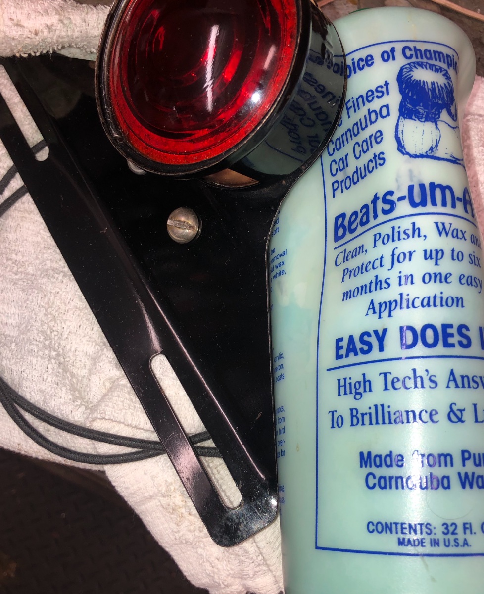 Just used it on this NOS aftermarket tail lamp. The old enamel was dull and dirty, but have learned over the years don't scrub or use grit polishing compounds as you will streak and scratch the old finishes. Just a little wet on the rag, and pure wax to clean the surfaces, then lightly wipe off for a shine and preservation.