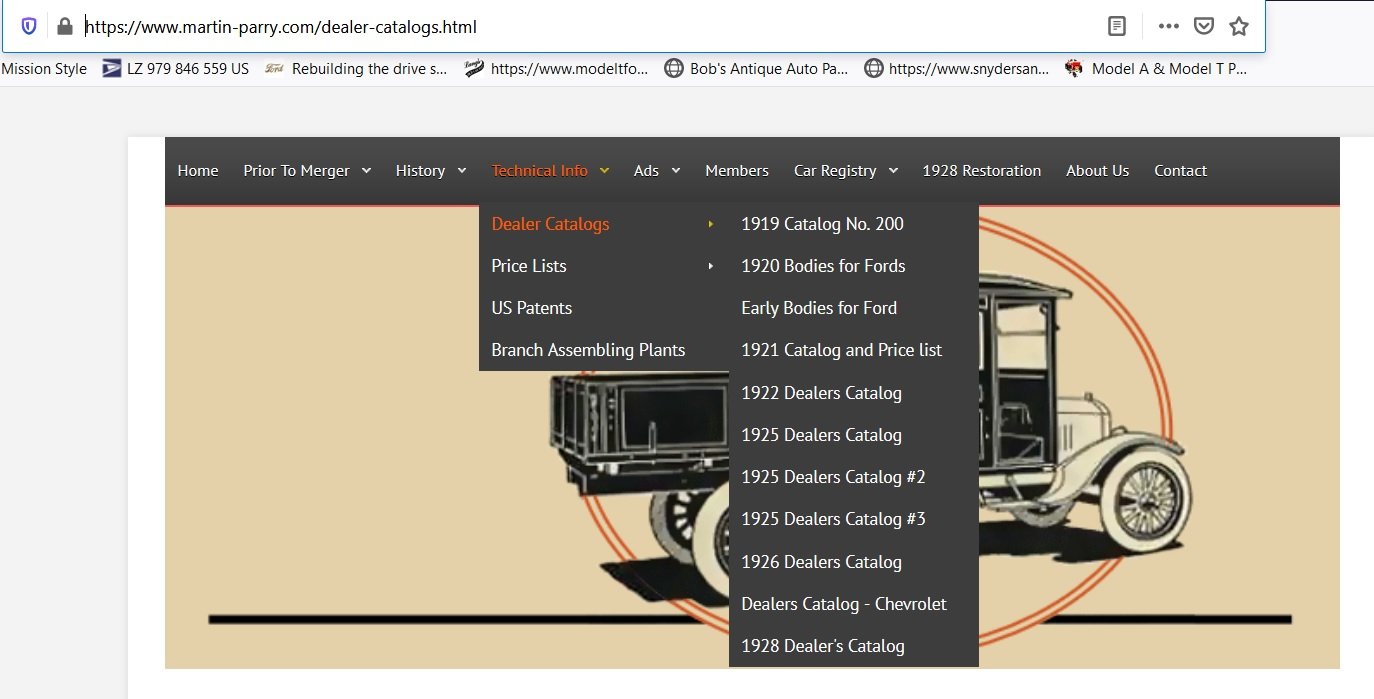 His info saved and posted is by vast majority model T ford related. The company also made bodies for other vehicles.The car Ben restored, the 1928 ford station wagon is right at the end of production, when the M-P company was then bought by General Motors, and renamed the Chevrolet Body Division. Ben’s beautiful 1928 wagon is one of 3 or 4 know survivors, and likely Ford , although having provided the vast majority of the auto platforms for most of the years of M-P offerings, dealt the death blow when they came out with their own wood bodied vehicle in December 1928, the Model A station wagon. These were the first complete factory offerings of a wood bodied vehicle. I hope you can take a minute and check out this site. Another way in is just to google Martin-Parry.com