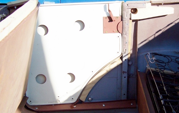 Similar view of rear seat door, showing the only wood used. The upper crimp channel has been pulled out of shape.