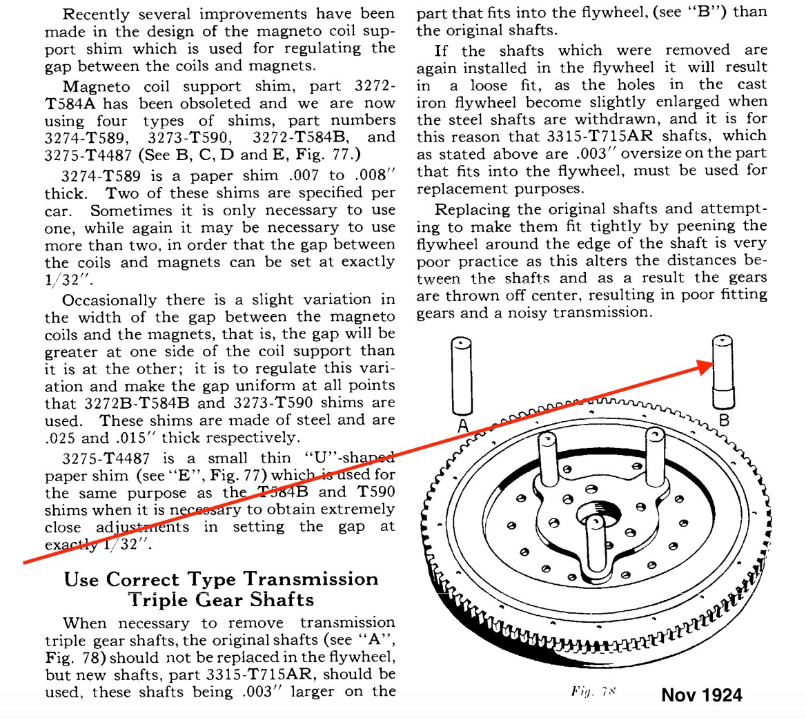 Ford Service Bulletin, Nov. 1924 describes the use of the 'AR' part suffix triple pin, as opposed to the factory pin which can't be reused if punched out as the hole in the flywheel is now enlarged slightly.