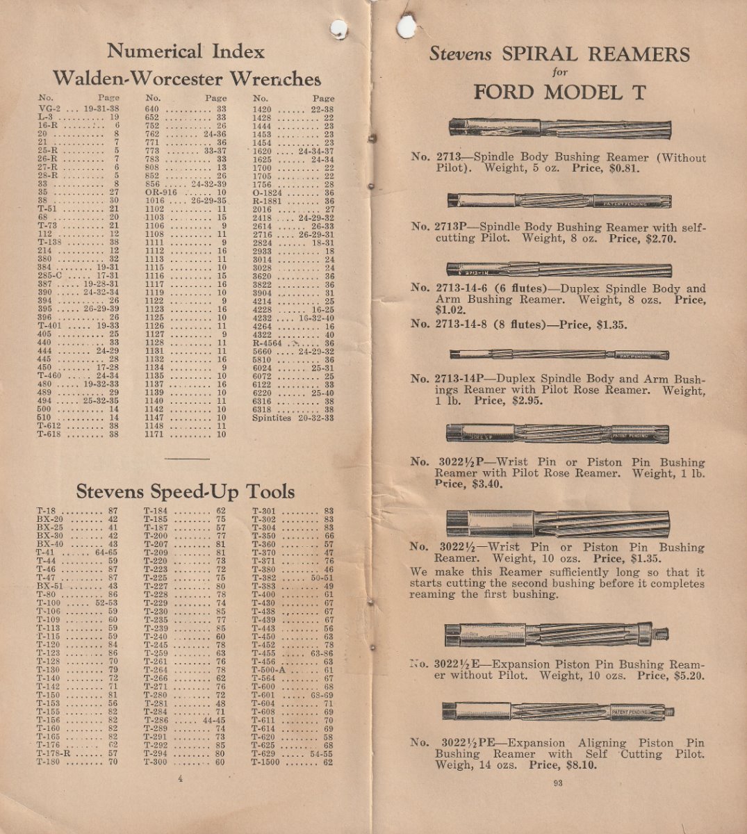 I finally acquired another Stevens catalog. They are very hard to find, and even harder to find one that is for sale. . It is what most folks consider the 1928 version. Stevens was bought out by Walden Worcester in late 1926. This is the catalog they put out after the buy out. It has most all the Stevens tools that were in the earlier catalog I re-printed several months ago,, and several tools that are in no other catalog that I know of. Most of them I have never seen in print before. I will post a few pic of some of the different tools. But I can not show all of them here. This catalog also has the Walden Worcester line of tools. Walden tools were not near the useable quality of the Stevens tools. Walden really stepped up their game when they acquired Stevens. Even though the Walden tools are not really as useful to us today, they are very collectable. This catalog will show what each Walden tool number is used for. There is also a small section of tools for the new Model A that just came out. There are a few pages of tools for Dodge, Chevy, Buick ect. It appears that Walden/Stevens was trying to widen their market in 1928. There is not much of the "other makes" tools. Most of the catalog will apply to our Model Ts. A lot of the Walden tools were considered to be useable on most all cars and trucks, so they are shown as "standard" tools even though they are some of the the same tools shown in the Model T section. This catalog is a very good reference for taking to a swap meet. The catalog is about 4 by 8-1/2 inch and has 96 pages not counting the covers.
