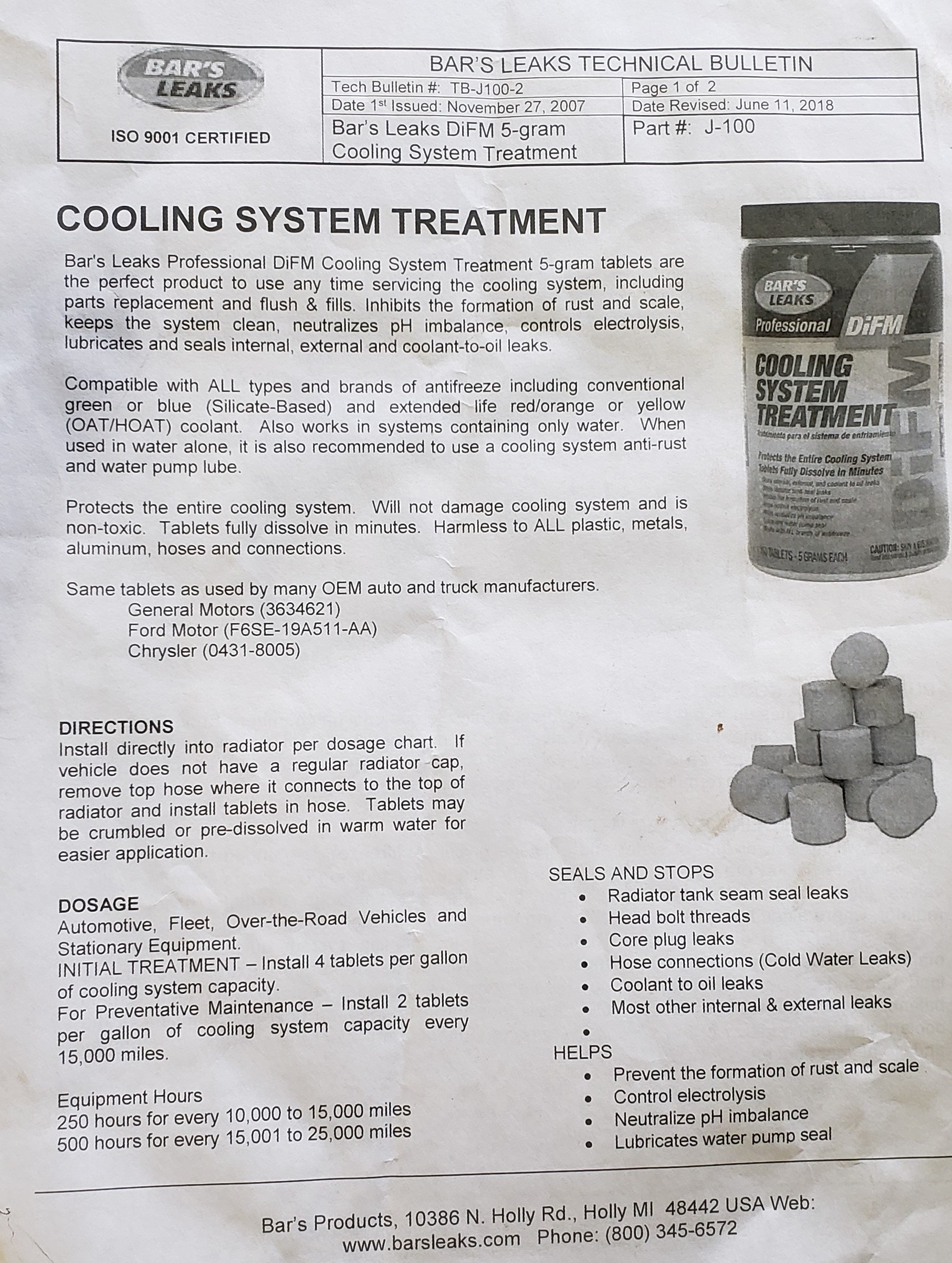 While I have seen people talk about just running 50/50 in their systems to prevent electrolysis between the cast iron and aluminum forming deposits and attacking the aluminum, I didn't find that. My passages were getting plugged up on the aluminum adapter plate between the cast iron block and head. Could be the type of aluminum used for the heads compared to the 6061 I used for the plate. I didn't know about the Bar's product, but depending on cost would give that a try. Except for the overflow tube, there is really no place to hang the other one in the radiator and once it is used up, you would have to retrieve the steel wire hanger if just dropped in.