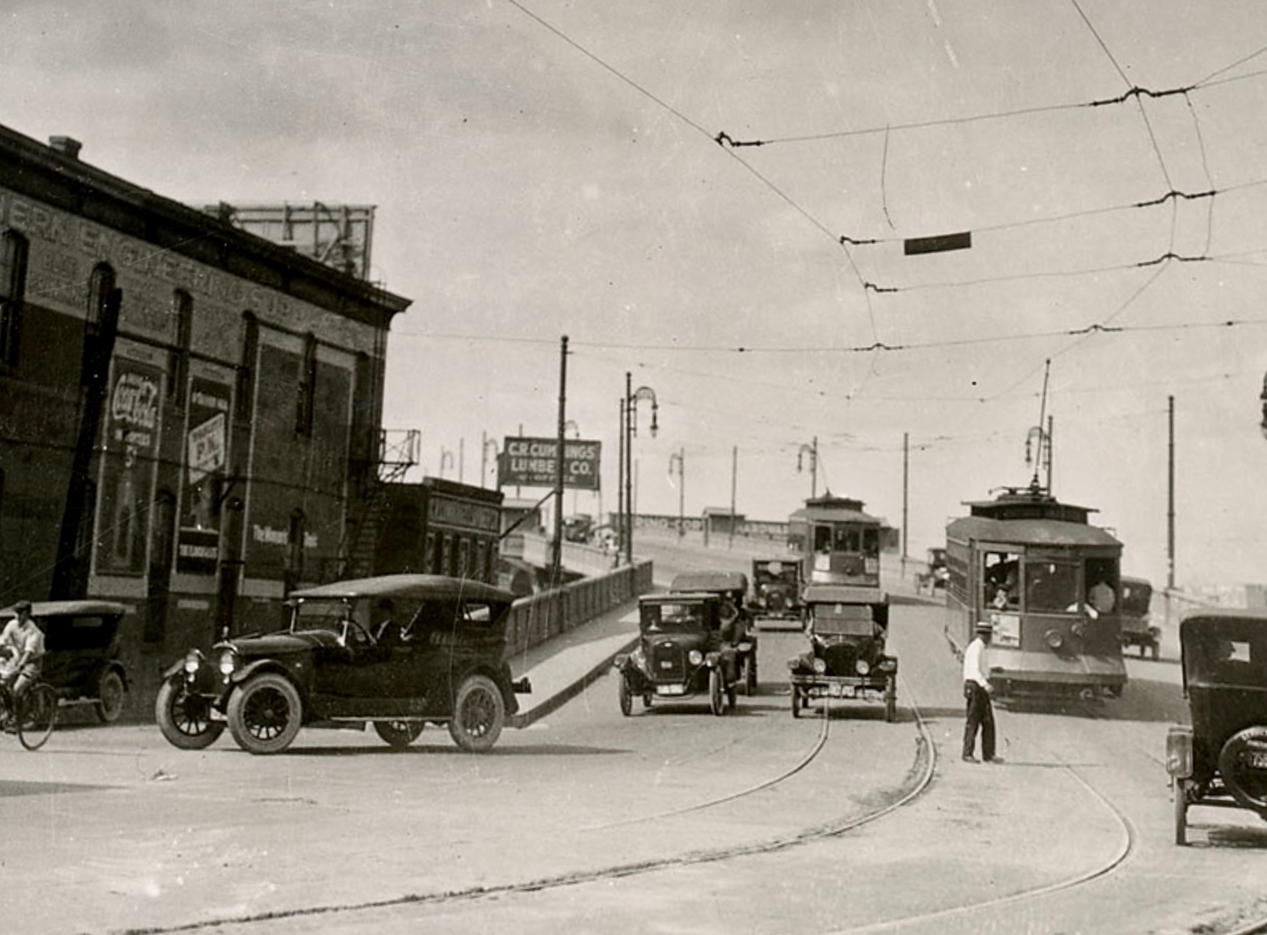 The no.8 photo shows the changing times in a city. The horse drawn wagon going down the street. It looks like it was some kind of vendors wagon.
