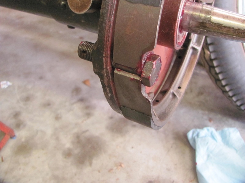 When fitting the new shoes, the bolt shaft should be greased lightly, same as a smear of grease on the cam ends and the cam lever. The anchor bolt shouldn't be fitted tight against the shoe either, just leave a slight slop for floating the hinge end of the shoe. The nut on the end of the anchor bolt is castle and the cotter will hold the assembly tight.** Be sure to install both springs. /b]