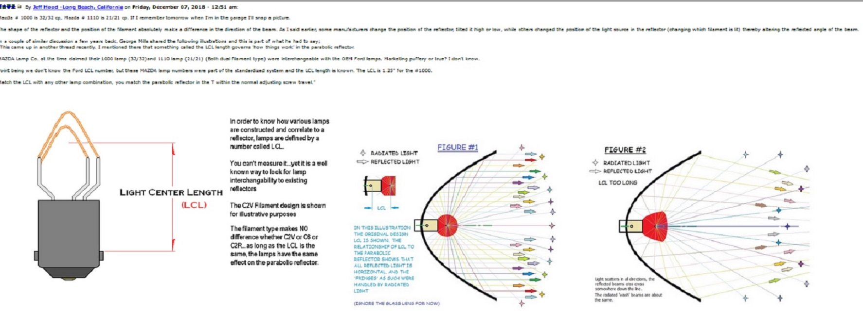 Now for the technical part - the concave reflector is expecting a near pin point light source a short distance from the socket called a focal point, (picture the incandescent bulb) to project light. If you look into a good reflector you can see almost tell where that is - a clear ring towards the back of the reflector. Most LED bulbs have an array of led chips in various configurations - with few if any that are located near the focal point. Some have some chips projecting outward that give the appearance of a brighter headlight when looking at it but do little to light up the road ahead (these are good for daytime driving lights). The other factor that make LED lights look "brighter" is their color temperature. Conventional bulbs are warm yellowish about 3200K with LEDs (most are white light) at about 6000K. So whiter light makes things look brighter. Lots of discussion in this posting about incandescent bulbs that is directly applicable to LEDs http://www.mtfca.com/discus/messages/82 ... 1544665848