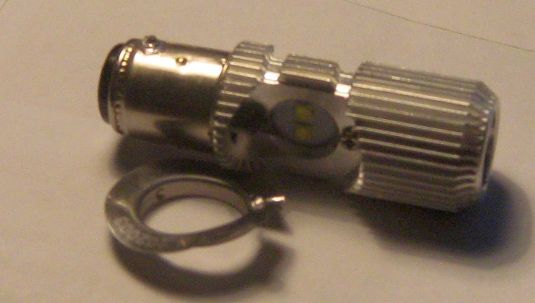 I had decided that I could likely use LED's originally intended for motorbike headlamps, with a suitable modification. The P15D base has the same diameter as that required for the Model T, but it uses a flange rather than two locking pins to locate it in the headlamp proper. I thought it should have been possible to remove the flange and solder a couple of pins in the correct place so that it could be installed into the T.
