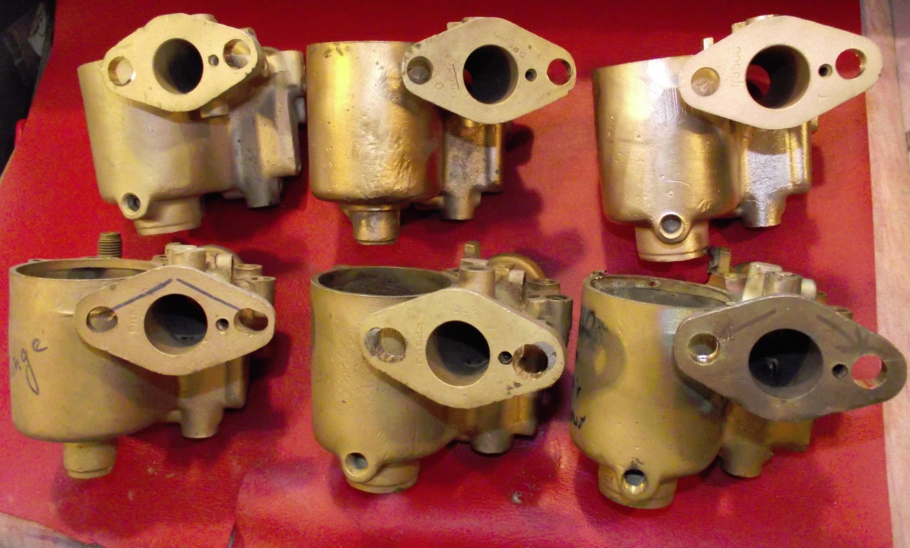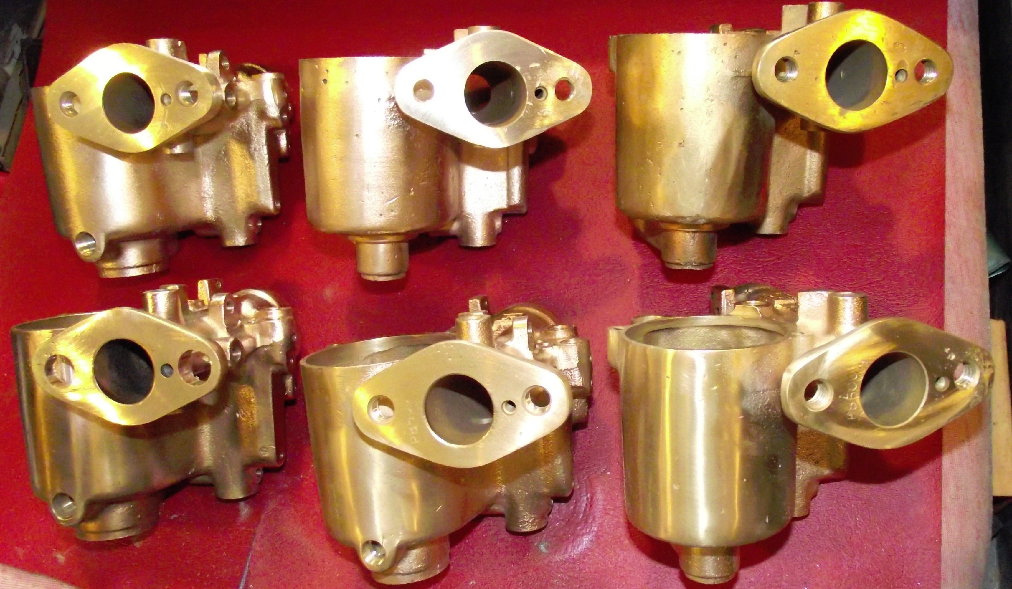 Been working all morning on getting some of these ready for assembly. Already had them bead blasted and passages drilled, just polished most of them, te-tapped all the threaded holes, resurfaced all the mating surfaces including where the seat screws into the bottom of the bowl which is almost always a mess, where all the caps screw in, internal threads where the main jet screws in, etc. Some of them I get in have been drilled out so 3/8 studs won't work or the threads are too bad to use so I have a jig to drill them out, thread them with 1/2 x 24 threaded brass stock, with silver solder to hold it in, have a drilling jig to drill the holes and thread them 3/8 - 16 so they are correct for an OF. Most of the flanges are bent to some extent so I run those through a process to flatten them so they don't leak air around the flange. They will all get bushings for the throttle shaft, too, I need to make a whole pile of bushings before I get much further.