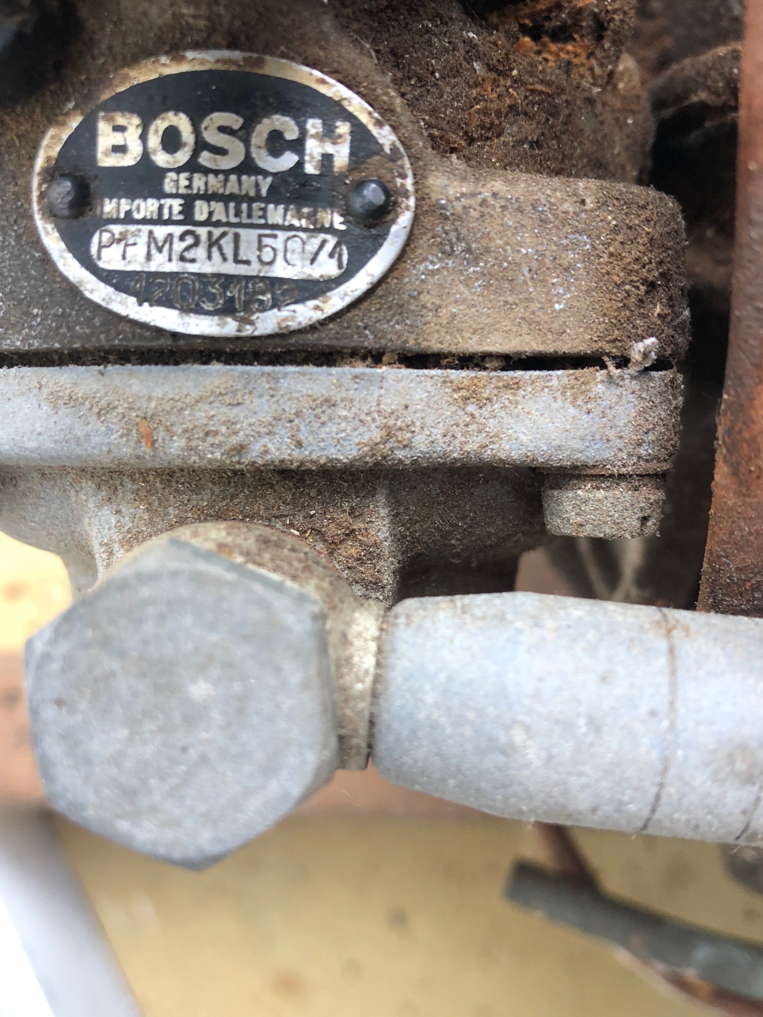 It's definitely French, after WW2, the Bosch pump is imported from Germany (i.e.ïmportee d'Állemagne") probably for one of the scores of light commercial vehicles made after the war in the 50s, most "voiturettes" for personal transport were built with gasoline engines, but some light commercial vehicles were furnished with Diesel engines.