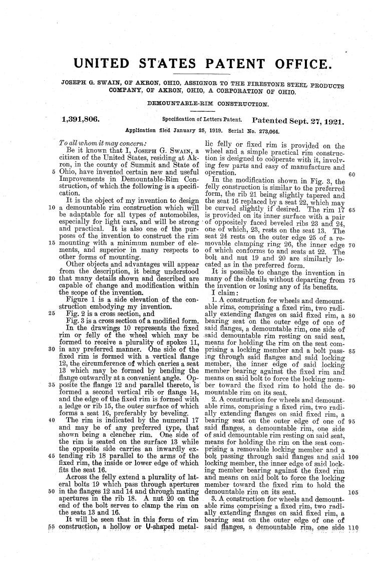 That it is a patent for a demountable felloe and rim and that it was Patented Sept 27, 1921 i.e. 9-27-21 which is the same date stamped into the metal felloe indicate it might be the same felloe and rim. If the Patent date was different then it probably would not have been the patent for that wheel/felloe/rim. Initially I saw the Jan 25, 1919 date and thought – well this patent is not for that felloe/wheel. But then I zoomed in and read that was the date the Patent was applied for NOT when it was Patented.