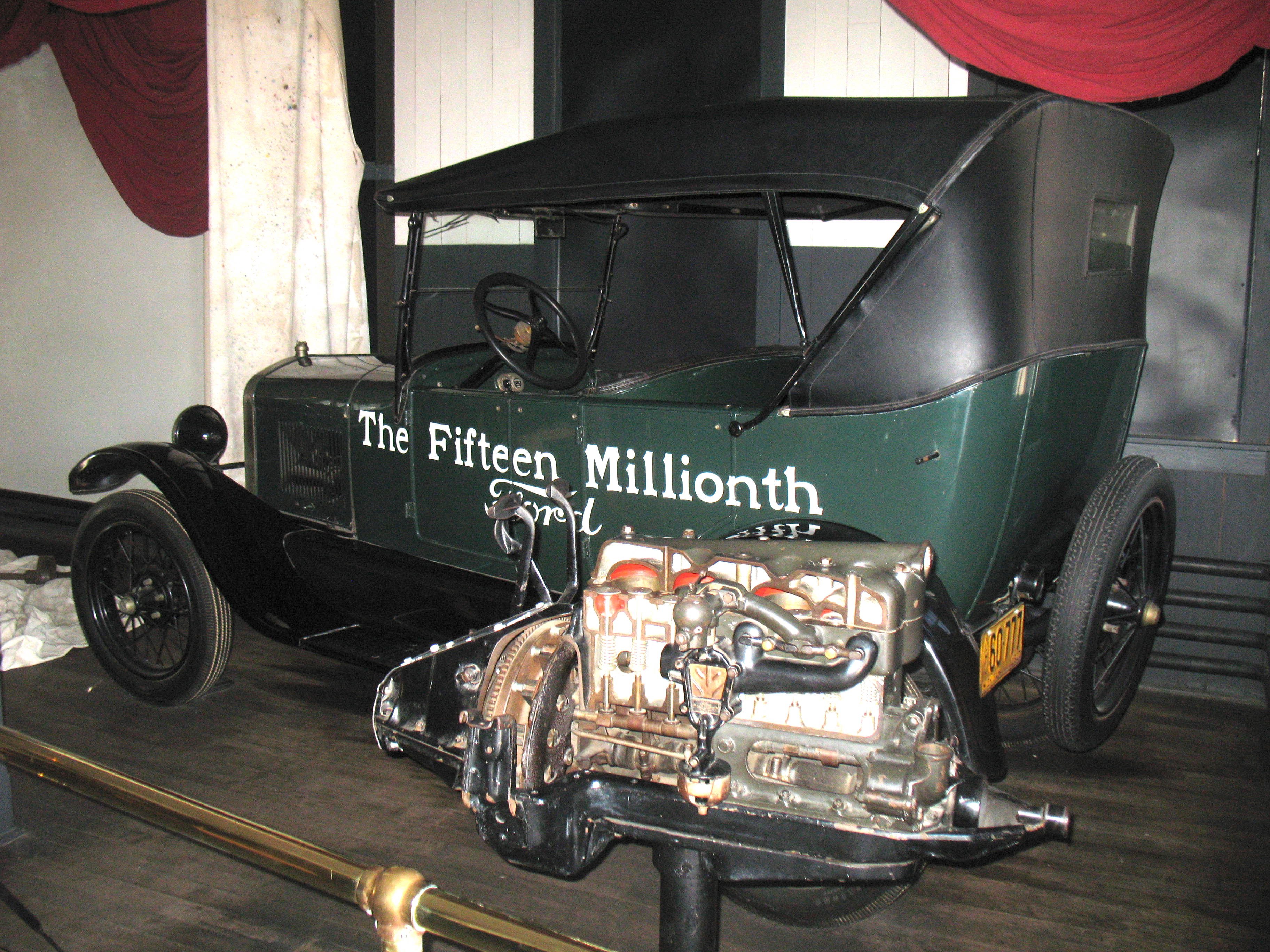 Caution regarding the 15,000,000 model T touring. It came off the assembly line painted blue with silver lettering. It was overpainted in green during the 1950's, the current white lettering was applied recently.
