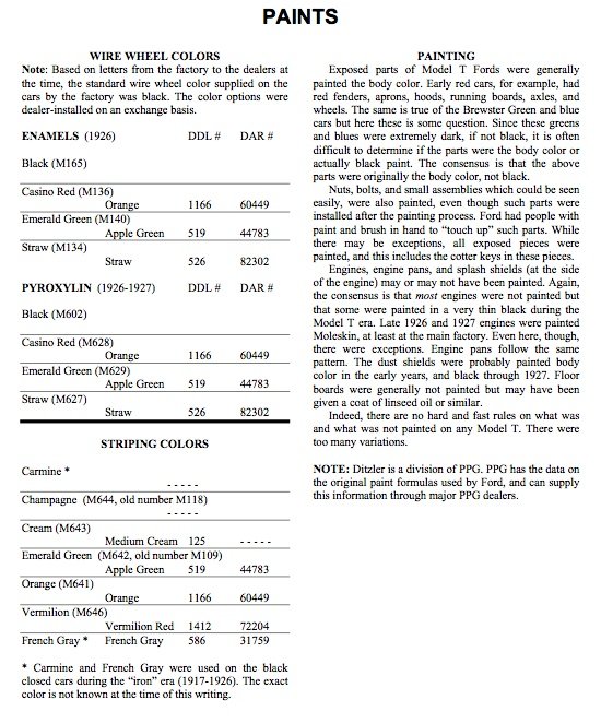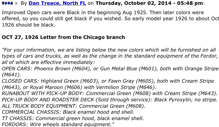 Dan, I'm a bit confused as to the new colors letter that you posted. It lists two new colors for the open cars, neither of which is Highland Green. I know that the 15 millionth touring car was Highland Green, as is my '27 touring car. Mine has an old repaint, but it was not a restoration and I have not found anything that would lead me to believe that the color was not original. Were they already offering Highland Green when that letter was written, or was it added later?