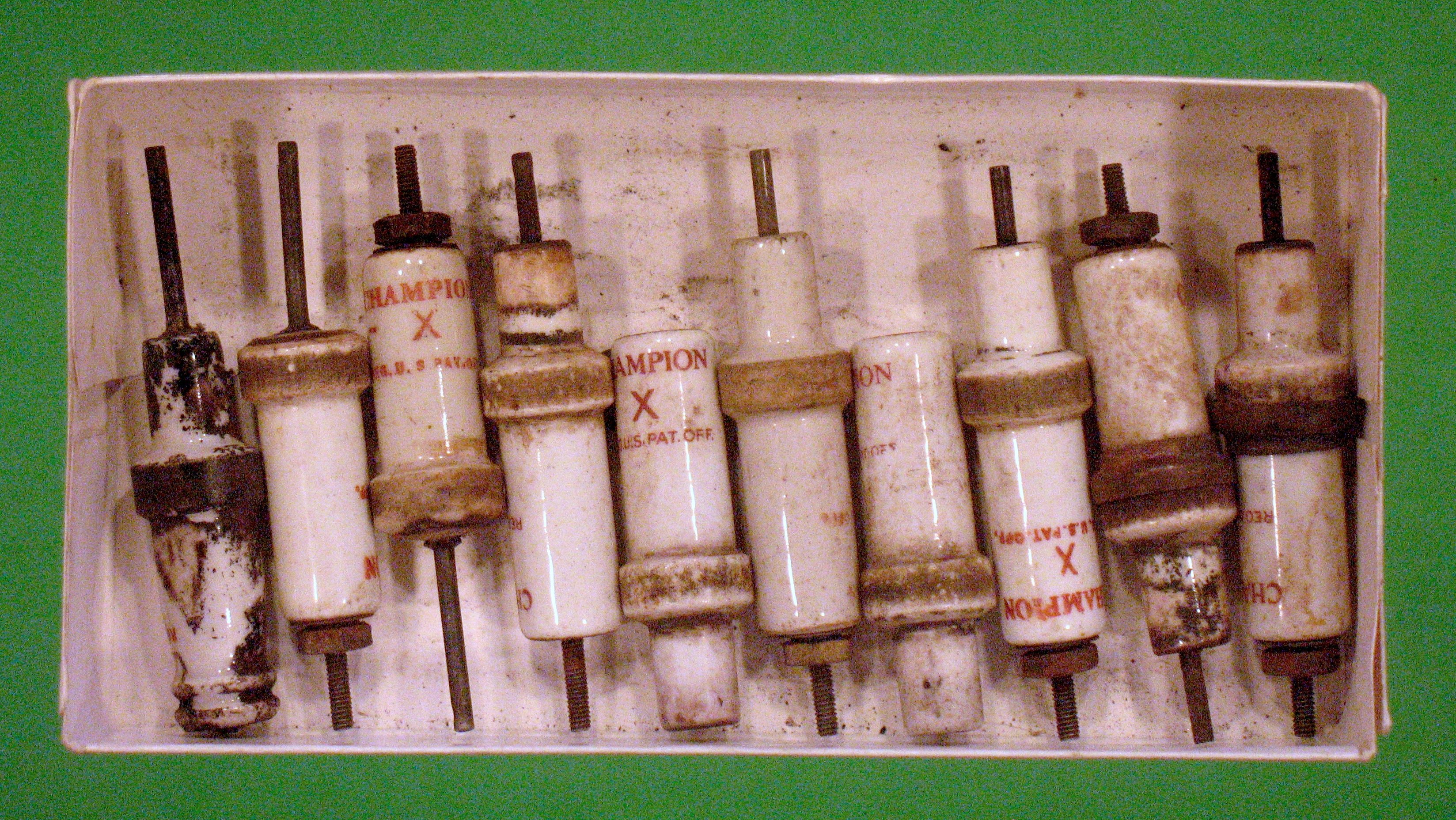 Champion X plugs found at Hershey. I believe I paid $2 each for these. Most are quite restoreable and usable.