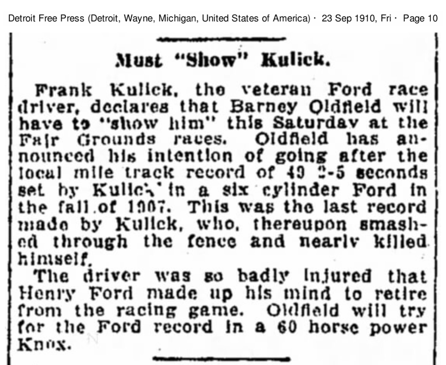 And so, Frank Kulick saved Ford and Detroit face, beating the world record holder in both the mile and for fastest speed ever recorded, clocking a 50 second mile on the circular dirt track at the Michigan State Fairgrounds.