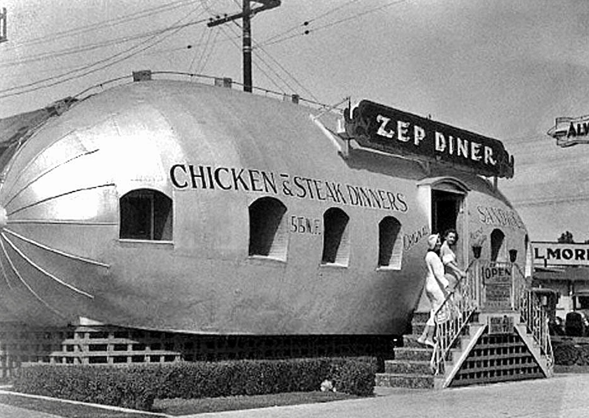 Norm's mention of the San Joaquin Valley reminds me of a cafe on old US 99 between Bakersfield and Fresno, I don't recall exactly where. It had a plane stuck nose down on the roof to look like it had crashed into the building. I've seen photos of similar places, but so far I haven't found a picture of that one.