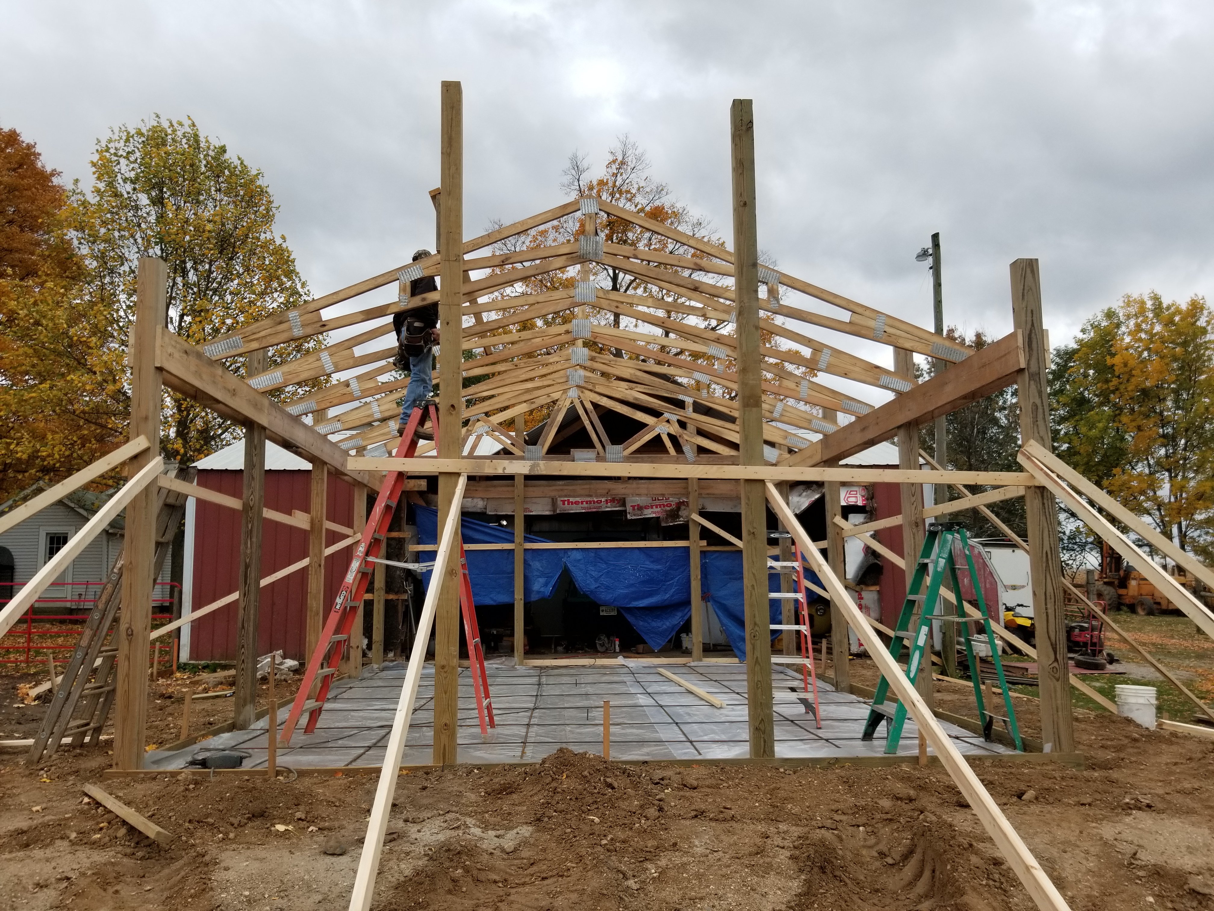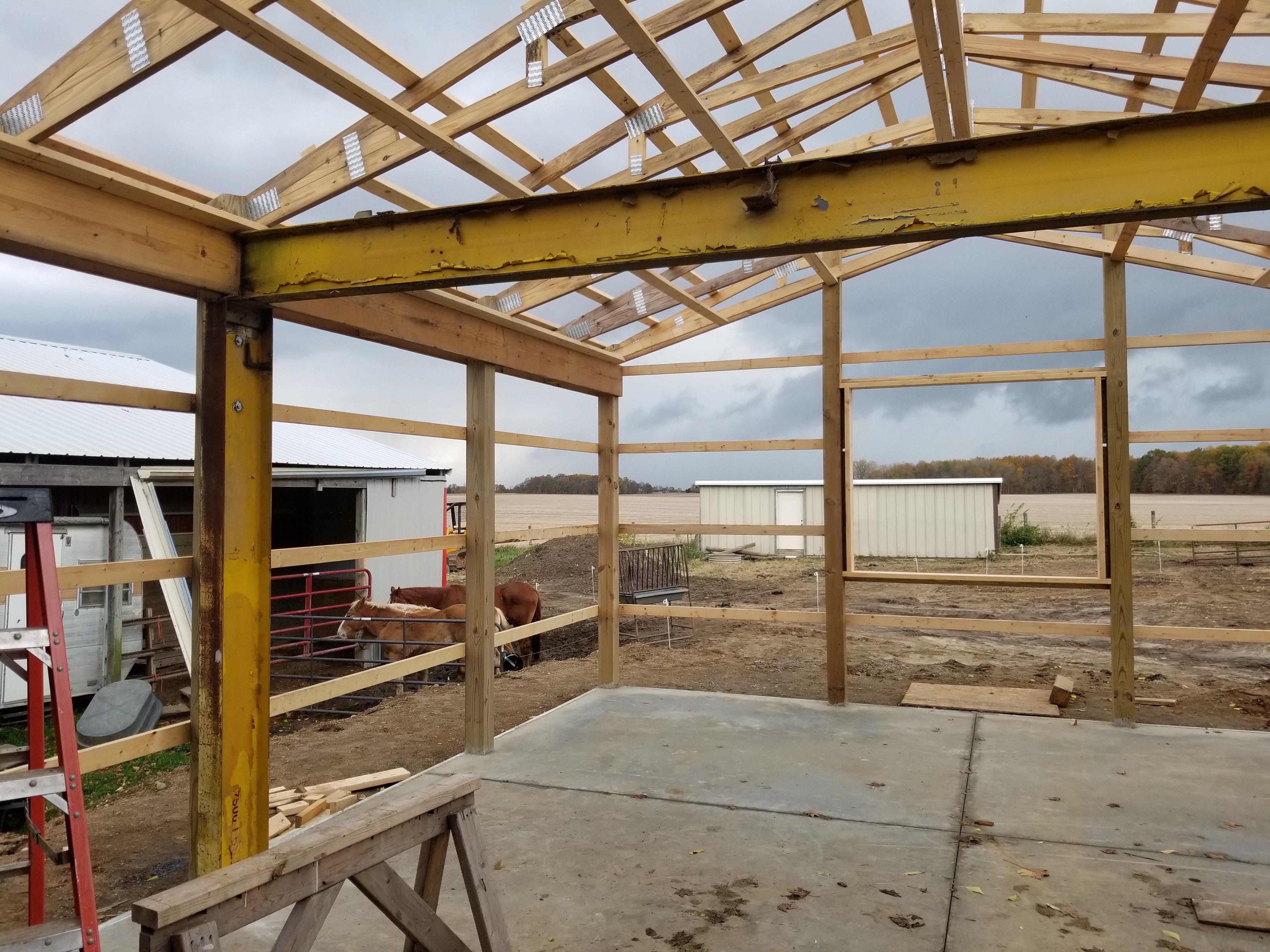 I have collected materials including trusses that have been stored in my big barn for years. I 1st had to modify the leen-to on my big barn for hay storeage and horse shelter. Another factor in the project timeline ( didnt think my horse would live this long).