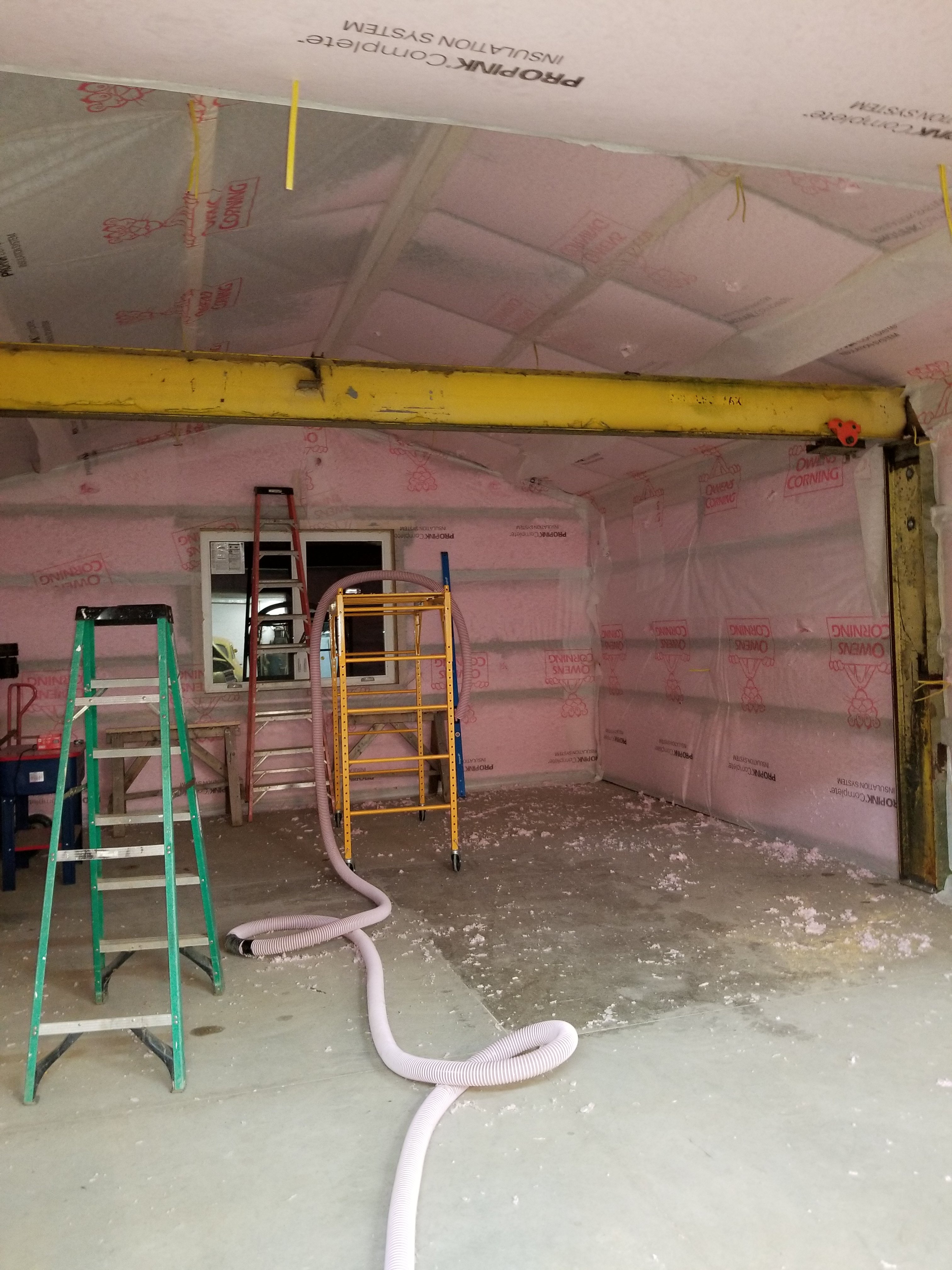 8 inches of blown fiberglass in the walls and 16 to 20 inches in ceiling. Finally a shop I can keep heat in all winter.